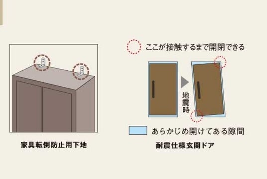 地震対策機能付きエレベーター、耐震枠玄関ドア、足元保安灯、耐震ラッチ、家具固定用下地(リビング・ダイニング、キッチン)など、さまざまな対策を施しています。