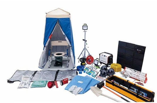 機能ラジオ、災害用トイレセット、ヒートパック、アルミック救急シート等が同梱されたイス付き避難用「オリジナル防災リュック」を全戸に配置。阪神・淡路大震災などの経験から、路上へのガラス等の飛散を考慮してリュック形式とし、避難者などが安全に休憩を取れるようイス付きとしています。共用部には「防災備蓄倉庫」を設置し、LEDライト、マンホールトイレ、蓄電池用太陽光パネル等を用意。また、エレベーター内に万が一閉じ込められた場合のために、「エレベーター内防災キャビネット」も設置しています。