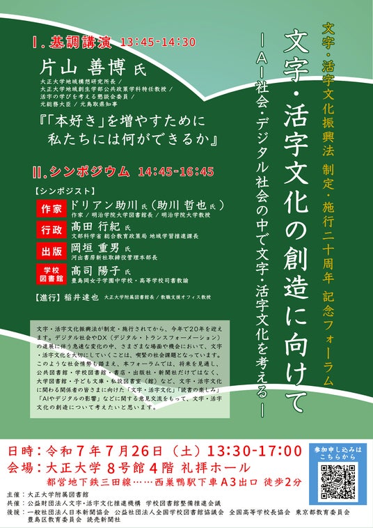 大正大学(学長:神達知純、所在地:東京都豊島区)附属図書館は、2025年7月26日(土)に「文字・活字文化振興法制定・施行20周年記念フォーラム」を開催します。