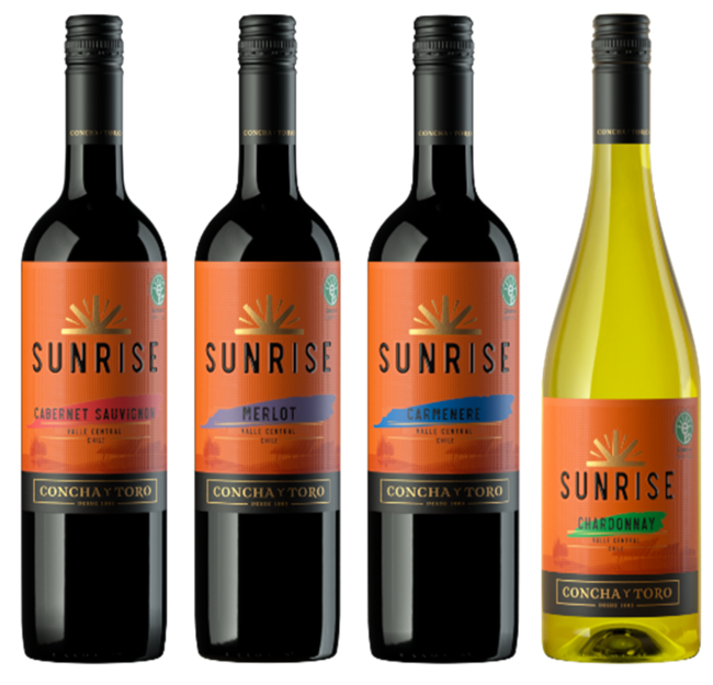 「サンライズ」シリーズは、南米チリの年間約300日の日照がある畑で、太陽の恵みを受けて育ったブドウを使用した濃厚な果実味をお客様から支持いただいております。また、今年で国内発売25周年を迎えます。造り手であるコンチャ・イ・トロ社では、長年環境に配慮したワイン造りにこだわっており、積極的に太陽光発電を行っています。今回のリニューアルを期に、ブドウの栽培からワインのボトリングまで100%太陽エネルギー※4を使用することとなりました。