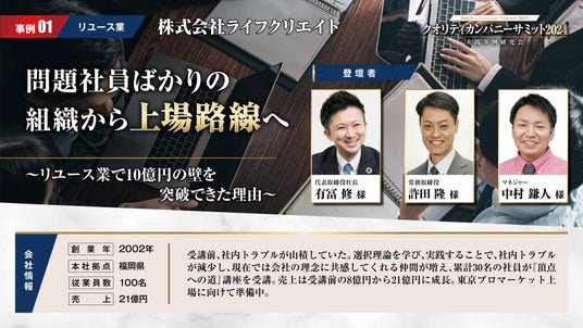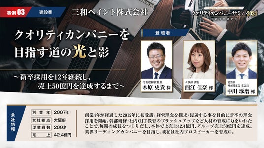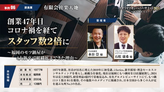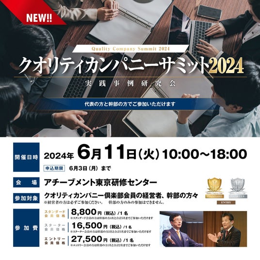 アチーブメント株式会社は6月11日(火)に年に1度のイベント「クオリティカンパニーサミット2024」を開催。クオリティカンパニーを目指す経営者・幹部が一同に会す「クオリティカンパニーサミット2024」では、1500社の中から選ばれた各業界を代表する特別講師が、自社での実践事例をプレゼンテーションします。