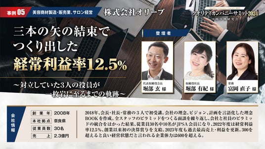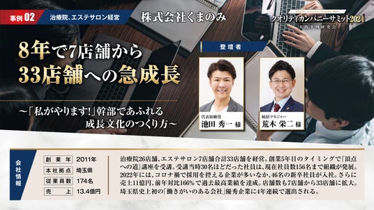 登壇する企業の多くが、社員が働きやすい環境づくりに注力し、離職率を下げ、社員定着率を高めている。また、経営者自らが行う勉強会や、社内研修の導入によって、会社全体のパフォーマンスを高め、大幅な業績成長を成し遂げています。
