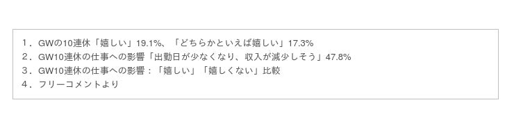 1.GWの10連休「嬉しい」19.1%、「どちらかといえば嬉しい」17.3%