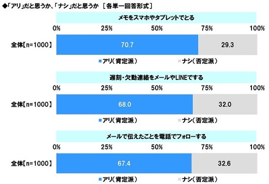 ≪メモをスマホやタブレットでとる≫では「アリ」は70.7%、「ナシ」は29.3%、≪遅刻・欠勤連絡をメールやLINEでする≫では「アリ」は68.0%、「ナシ」は32.0%、≪メールで伝えたことを電話でフォローする≫では「アリ」は67.4%、「ナシ」は32.6%となりました。(図14)