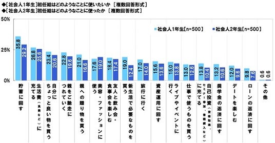社会人1年生と2年生の回答を比較すると、「貯蓄に回す」(社会人1年生35.8%、社会人2年生29.2%)、「新生活で必要なものを買う」(社会人1年生19.0%、社会人2年生12.4%)では、社会人2年生が経験した実際の使いみちより社会人1年生が考える希望の使いみちのほうが5ポイント以上高くなりました。(図1)
