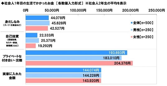かかった金額の平均をみると、≪身だしなみ(スーツ・化粧品など)≫では44,078円、≪自己投資(資格取得、セミナー参加、書籍購入など)≫では22,333円、≪プライベートな付き合い・交際≫では193,693円、≪実家に入れた金額≫では144,074円となりました。