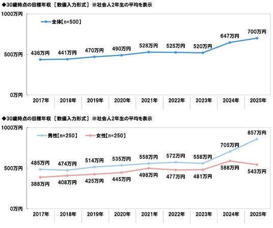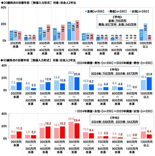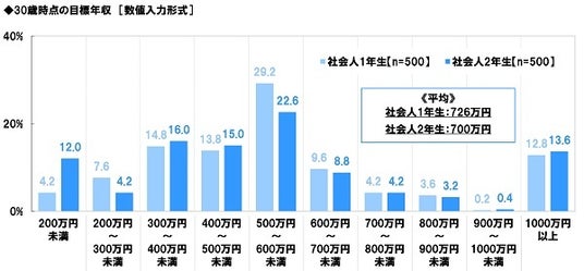 ・30歳時点の目標年収 社会人2年生の男性は平均857万円、昨年から152万円増加
