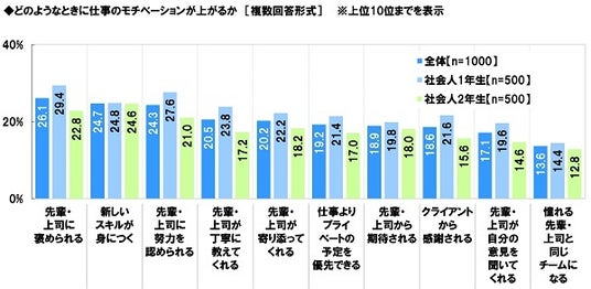 全回答者(1,000名)に、どのようなときに仕事のモチベーションが上がるか聞いたところ、「先輩・上司に褒められる」(26.1%)が最も高くなり、「新しいスキルが身につく」(24.7%)、「先輩・上司に努力を認められる」(24.3%)、「先輩・上司が丁寧に教えてくれる」(20.5%)、「先輩・上司が寄り添ってくれる」(20.2%)が続きました。