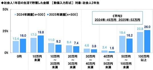 ・社会人1年目に貯蓄した金額 平均52万円、昨年調査から3万円増加
