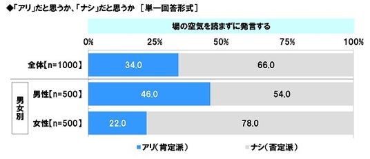 ≪場の空気を読まずに発言する≫では、「アリ」は34.0%、「ナシ」は66.0%となりました。
