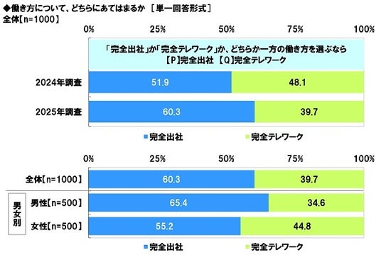 全回答者(1,000名)に、「完全出社」か「完全テレワーク」か、どちらか一方の働き方を選ぶならどちらを選ぶか聞いたところ、「完全出社」は60.3%、「完全テレワーク」は39.7%となりました。