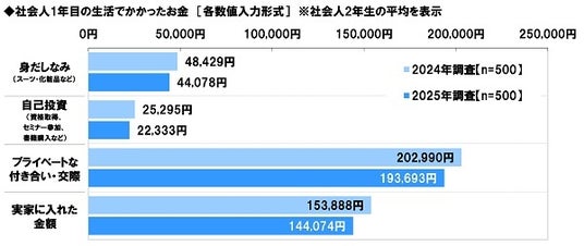 2025年春(4月)から働き始める社会人1年生500名と、就職してから1年が経つ社会人2年生500名に、社会人1年目のお金の使い方について質問しました。