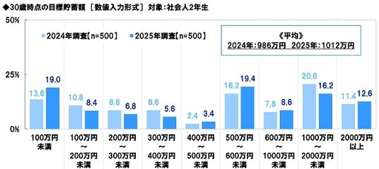 社会人2年生の30歳時点の目標貯蓄額について、昨年の調査結果と比較すると、目標貯蓄額の平均は、2024年986万円→2025年1012万円と26万円増加しました。(図6)