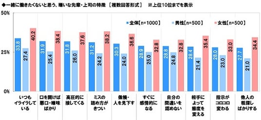 全回答者(1,000名)に、一緒に働きたくないと思う、嫌いな先輩・上司の特徴を聞いたところ、「いつもイライラしている」(33.8%)が最も高くなりました。次いで高くなったのは、「口を開けば悪口・嫌味ばかり」(31.9%)、「高圧的に接してくる」(31.8%)、「ミスの詰め方がきつい」(31.2%)、「傲慢・人を見下す」(30.3%)でした。