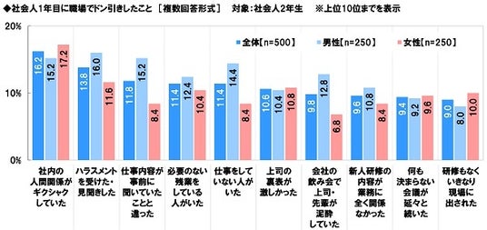 社会人2年生(500名)に、社会人1年目に職場でドン引きしたことを聞いたところ、「社内の人間関係がギクシャクしていた」(16.2%)が最も高くなり、「ハラスメントを受けた・見聞きした」(13.8%)が続きました。次いで高くなったのは、「仕事内容が事前に聞いていたことと違った」(11.8%)、「必要のない残業をしている人がいた」「仕事をしていない人がいた」(いずれも11.4%)でした。