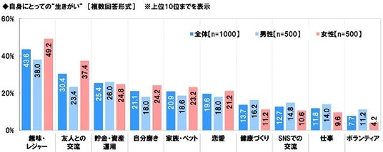 全回答者(1,000名)に、自身にとっての“生きがい”を聞いたところ、「趣味・レジャー」(43.6%)が最も高くなりました。次いで高くなったのは、「友人との交流」(30.4%)、「貯金・資産運用」(25.4%)、「自分磨き」(21.1%)、「家族・ペット」(20.9%)でした。