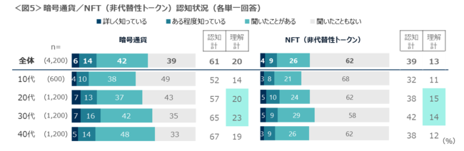 「暗号通貨」の認知率は61%、「NFT(非代替性トークン)」は39%。理解度は、20代~30代において、「暗号通貨」「NFT」ともに高い。<図5>