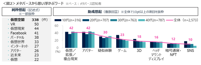 メタバースから思い浮かぶワードは、純粋想起では「仮想空間」が特に多く、次いで「VR」「仮想現実」など”仮想”という言葉が目立った。助成想起は「仮想/拡張/複合現実」と「アバター」が42%、「疑似体験」が30%。15~19歳は「ゲーム」の想起が38%と高い。<図2>