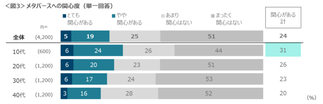 メタバースの説明文を提示し関心度を聴取した。「とても関心がある」は5%、「やや関心がある」は19%、合わせて24%はメタバースへの関心を示した。若い世代ほど関心度は高いものの、最も高い15~19歳で31%程度であった。<図3>