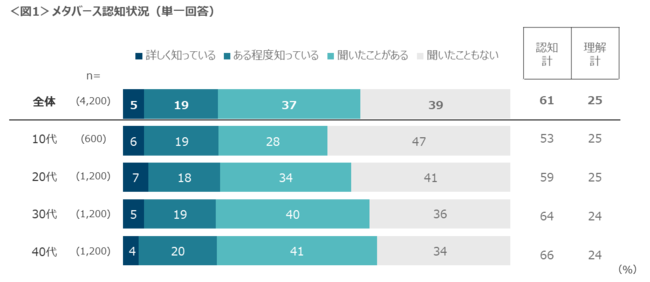 “メタバース”という言葉を「詳しく知っている」は5%、「ある程度知っている」は19%、「聞いたことがある」は37%と合わせて61%の認知率。理解度(詳しく+ある程度知っている)は年代による差はないが、「聞いたことがある」は年代が上がるほど高くなる。<図1>