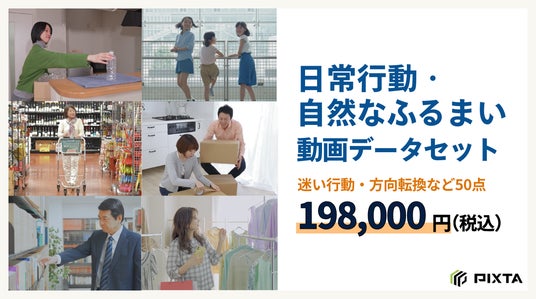 ピクスタ株式会社(東京都渋谷区 代表取締役社長:古俣大介、東証スタンダード:3416)が運営する写真・イラスト・動画・音楽素材のマーケットプレイス「PIXTA(ピクスタ)」は、「機械学習用画像・動画データ提供サービス」として、動画50点・25種類の動作を収録した「日常行動・自然なふるまい動画データセット」を販売いたします。本データセットは、単純な動作の切り出しではなく、実環境における文脈を伴う行動に着目して構成されています。動き出しや停止、方向転換、迷いといった行動の変化に着目した動画を収録しており、行動理解や行動予測といったAI開発に活用しやすいデータセットとなっています。