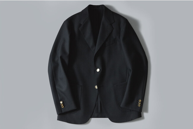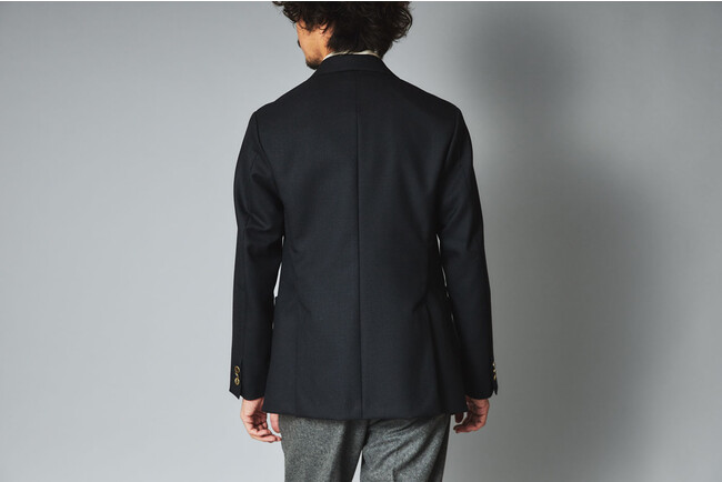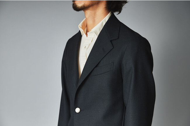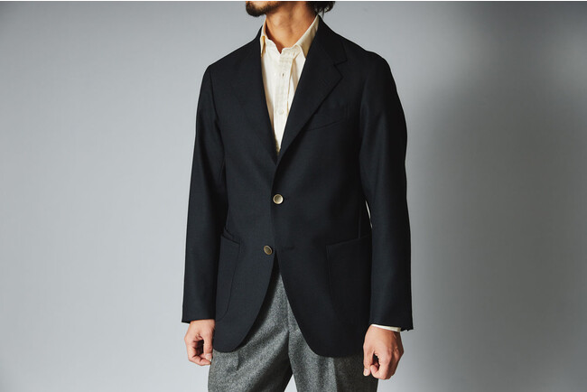 「目下、久々の紺ブレブームに沸くファッション業界。その影響でかつてないほど多くのブランドから紺ブレが登場していますが、それらは概して、昔ながらのスタイルを忠実に踏襲したトラッド系、イタリア仕立ての影響を受けたドレス系、ルーズフィットなデザイナーズ系の3種類のみ。でも僕としては、それらの中間をゆくバランスが理想的でした。直球のトラッドでもなく、ドレス系よりも気楽に着られて、それでいてあくまで大人っぽい。そんなバランスの紺ブレが欲しかったんです。後で解説するとおり、1920年代の英国ジャケットにも通じる特徴を備えていますが、ヴィンテージ回顧というよりもあくまで“今のクラシック”を追求してたどり着いたバランスですね」(四方さん)