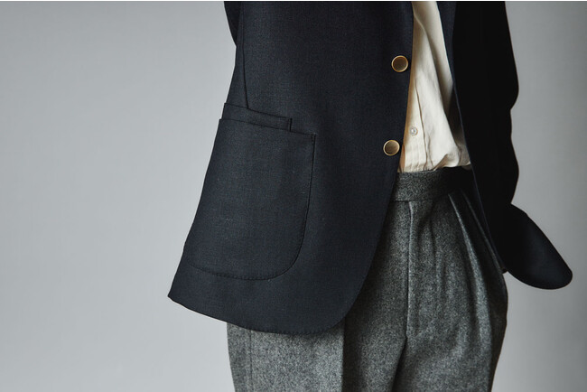 「程よくゆとりをもたせたシルエットや芯地を省いたアンコン仕立てなど(ともに後述)、デザイン面ではリラックス感を意識しつつ、カジュアル専用ではなくタイドアップもできるドレス感が欲しかった。なので、生地は英国羊毛によるクラシックなホップサックを採用しました。ユルすぎない表情で、大人な本格感を表現できたと思います」 (四方さん)