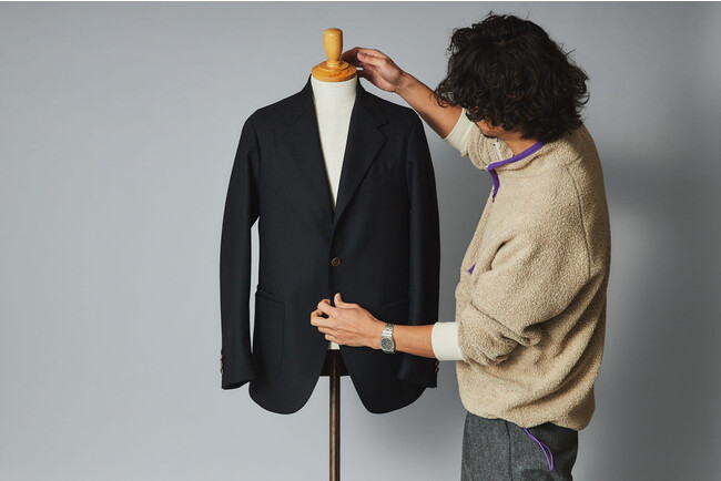 リラックス感を表現するため、芯地などを極力省き、身頃の裏地をゼロにしたアンコン仕立てを採用。表地をジャケットの内側まで広く伸ばした“大見返し”仕立てにより、芯地を省きつつ保形性を維持しています。
