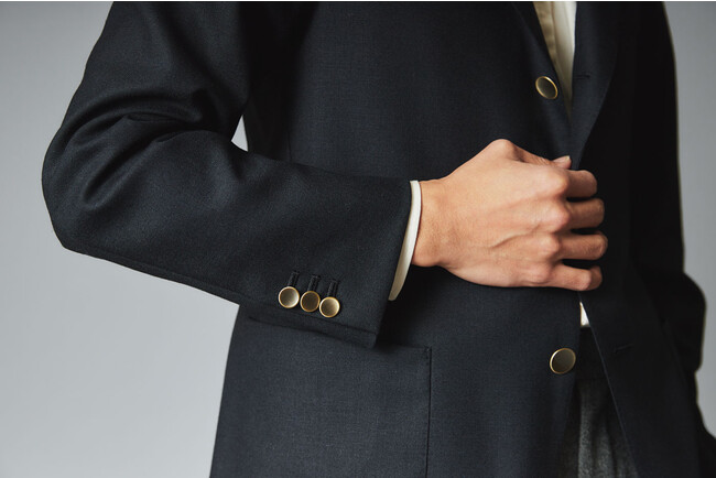 「一般的な紺ブレにありがちな金ボタンではなく、あえてアンティーク調のものをセレクトしました。大人らしい渋さを醸し出すとともに、金ボタンに苦手意識のある方でも着ていただきやすくなっていると思います」 (四方さん)