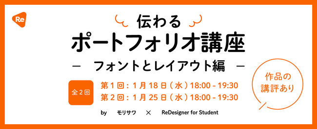 株式会社モリサワは、デザイナーを目指す学生の就活を支援するプラットフォーム「ReDesigner for Student」と2023年1月18日(水)、25日(水)の全2回にわたる「伝わるポートフォリオ講座 フォントとレイアウト編」を合同開催し、講師としても登壇します。