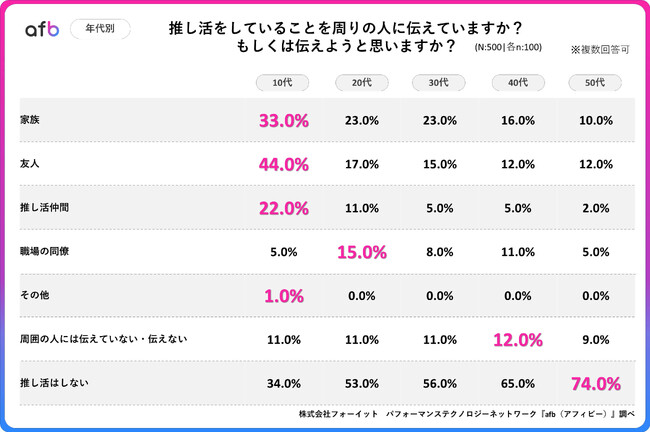 パフォーマンステクノロジーネットワーク「afb(アフィビー)」< https://www.afi-b.com/ >の開発運用をおこなう株式会社フォーイットは、全国の10代~50代までの男女500人を対象に推し活に関するアンケートを実施し、年代別・男女別等の特徴についてまとめました。