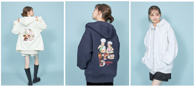 ホリデーシーズンにぴったりなWinter Collectionは、ゴールドとブルーがアクセントカラーのキラキラとしたデザイン。ミル作のスイーツをモチーフにしたオリジナルプリントが施されたジップパーカーや、ケーキからインスパイアを受けたワンピースとカーディガン、ネックレス、クリスマスデザインのプレート&マグカップ、ミルの手作りお菓子そっくりにデザインしたメタルチャームなど全7アイテムを販売いたします。