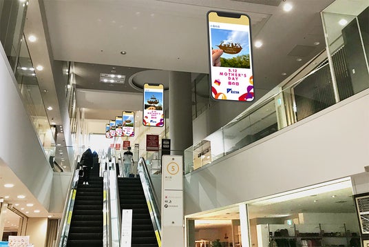 リトさんの母の日作品をメインビジュアルに使用して、2階ショーウインドーや各階にて母の日キャンペーンの装飾を展開します。