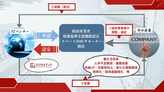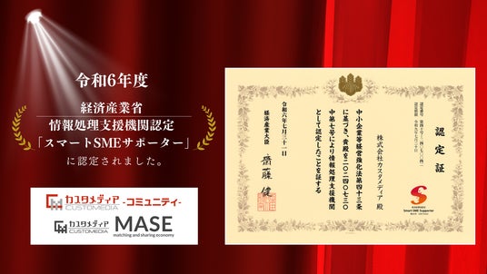 この度、弊社 カスタメディア(本店:大阪府大阪市、代表取締役:宮崎 耕史、以下 当社)のマッチングサイト・シェアリングエコノミーサイト構築プラットフォーム「カスタメディアMASE」および、コミュニティサイト・独自SNS構築プラットフォーム「カスタメディア」が、経済産業省より 「情報処理支援機関認定(スマートSMEサポーター認定)」 を取得いたしました!