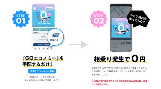 実施期間中『GOエコノミー』で予約し、他のお客様との相乗りが成立した場合、 その車両に乗車している全員の乗車料金が0円になります。