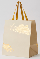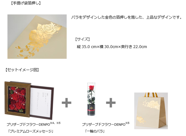 慶祝用電報台紙とプリザーブドフラワーDENPO「一輪のバラ」を、美しい金色の箔を施したオリジナルの手提げ袋でお包みし、「包む」文化が息づく日本のお祝いにふさわしく、その気持ちを品よく演出します。
