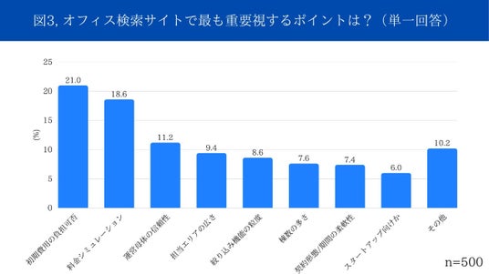 オフィス検索サイト利用時に重視するポイントとしては、「初期費用の負担可否」(21.0%)、「料金シミュレーションの可否」(18.6%)が上位となりました。