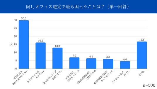 オフィス選定時に困った経験として最も多かった回答は、「希望に合う物件が見つからない」(30.0%)でした。次いで「自社に合うオフィスが分からない」(16.2%)が続き、約半数の経営者が、オフィス選びそのものに課題を感じていることが分かりました。