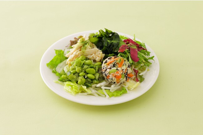自家製豆腐とチキンや葉物野菜の具沢山なサラダを、香り醤油ドレッシングと抹茶塩でお愉しみ下さい。