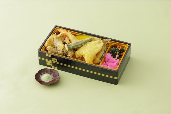 穴子、えび、キス、かぼちゃ、オクラ、まいたけの入った特製の天重です。期間限定で抹茶塩でお召し上がりください。
