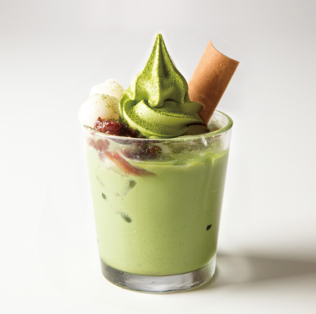 冷たい抹茶ラテの上に、抹茶ソフトクリームとあずきや白玉、八ッ橋がトッピングされています。
