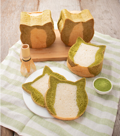 丸七製茶の抹茶を使用して焼き上げた優しい緑色の可愛い猫型の食パンです。