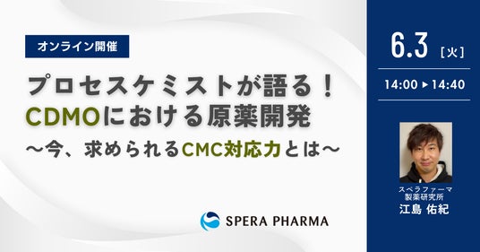 スペラファーマ株式会社(本社:大阪府大阪市、代表取締役社長:岩城 慶太郎)は、2025年6月3日(火)に「プロセスケミストが語る!CDMOにおける原薬開発 ~今、求められるCMC対応力とは~」ウェビナーを開催いたします。