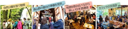 例えば、高山祭の屋台準備の見学や、県立自然公園・宇津江四十八滝でのガイド付き散策ツアー、地酒を飲み比べながらの日本酒講座、古い町並の歴史と変遷について学ぶ歴史講座など…。