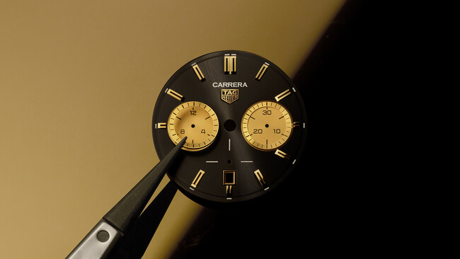 タグ・ホイヤーは、このユニークなレガシーをさらに発展させ、ブラックダイヤルにゴールドプレートのサブダイヤルを配したこれまでにないデザインに仕上げました。これは有名なRef.1158CHNのダイヤルカラーを反転させたものです。また、1970年代から80年代にかけて活躍したF1マシンであるブラック × ゴールドの伝説的なジョン・プレイヤー・スペシャル カラーも、愛好家にはお馴染みかもしれません。タグ・ホイヤーのアンバサダーであり世界チャンピオンのアイルトン・セナが操縦した、ロータス98Tも輝かしい戦歴の初期の頃にこの世界的に有名なカラーリングをマシンのボディに纏っていました。