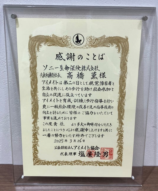 ソニー生命保険株式会社(代表取締役社長:高橋 薫、以下「当社」)は「アイメイト(盲導犬)育成による視覚障がい者の社会参加の支援」を目的として、2025年3月26日に公益財団法人アイメイト協会(代表理事:塩屋 隆男、以下「アイメイト協会」)へ寄付金の贈呈を行いました。また、四半世紀以上にわたる継続的な支援に対し、アイメイト協会 塩屋 隆男代表理事より感謝状が授与されました。