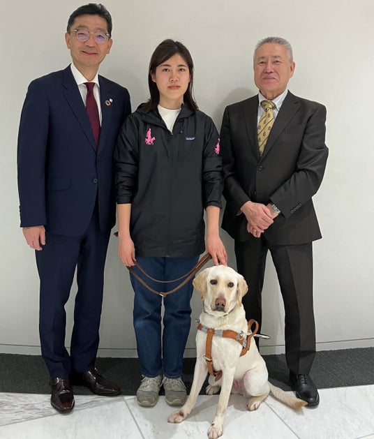 (左)当社執行役員 田部井 (中央)アイメイト協会 歩行指導員 (右)アイメイト協会 塩屋代表理事