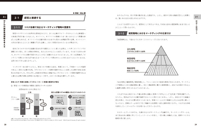 BtoBビジネスの経験が浅く、これから多くのことを学んでいく必要がある方に、現場の基礎知識を丁寧にお伝えするため、経営におけるマーケティングの概念や、施策ごとの細やかなKPIなど、BtoBビジネスの現場で求められる考え方を紹介しています。