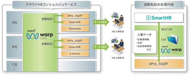 しかしながらこのサービスを利用する際には、クラウド人事労務ソフトウェアの「SmartHR」と人事・給与系ツールの「ePro_St@ff」に同様の情報を二重入力する必要や、更新時にも二重の修正作業が必要なため、導入企業(サービス業、2,000名規模)では年間100時間の入力工数がかかることが課題でした。