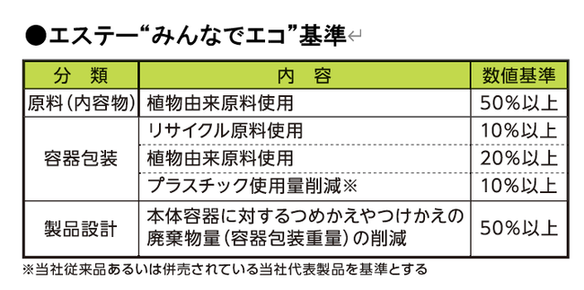 “みんなでエコ”マークは、環境に配慮した商品作りを推進するため、原料(内容物)・容器包装・製品設計において、エステーが独自に策定した環境配慮評価基準(表1)を定め、その基準を一つ以上クリアした製品に対してこのマークを表示します。